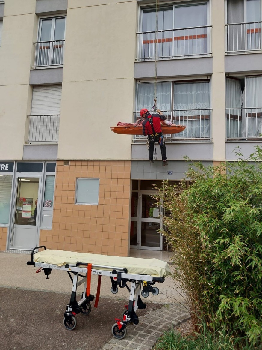 À la demande du médecin, ni l’escalier ni l’ascenseur n’étaient adaptés à une évacuation classique : la victime a donc été descendue strictement à l’horizontale, suspendue en rappel.
